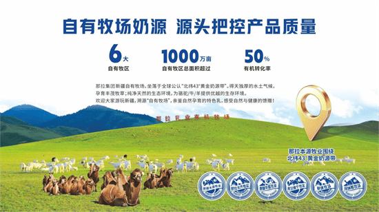 做为新疆驼奶财产的领军企业,那拉集团已建立起笼盖畜牧养殖、出产加工、仓储运输、市场发卖五大板块联动成长的全财产链模式。正在奶源扶植方面,那拉集团阐扬龙头企业带动感化,正在新疆建成六大自有牧区,面积近1000余万亩,此中无机牧场无机率达50%以上。